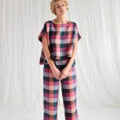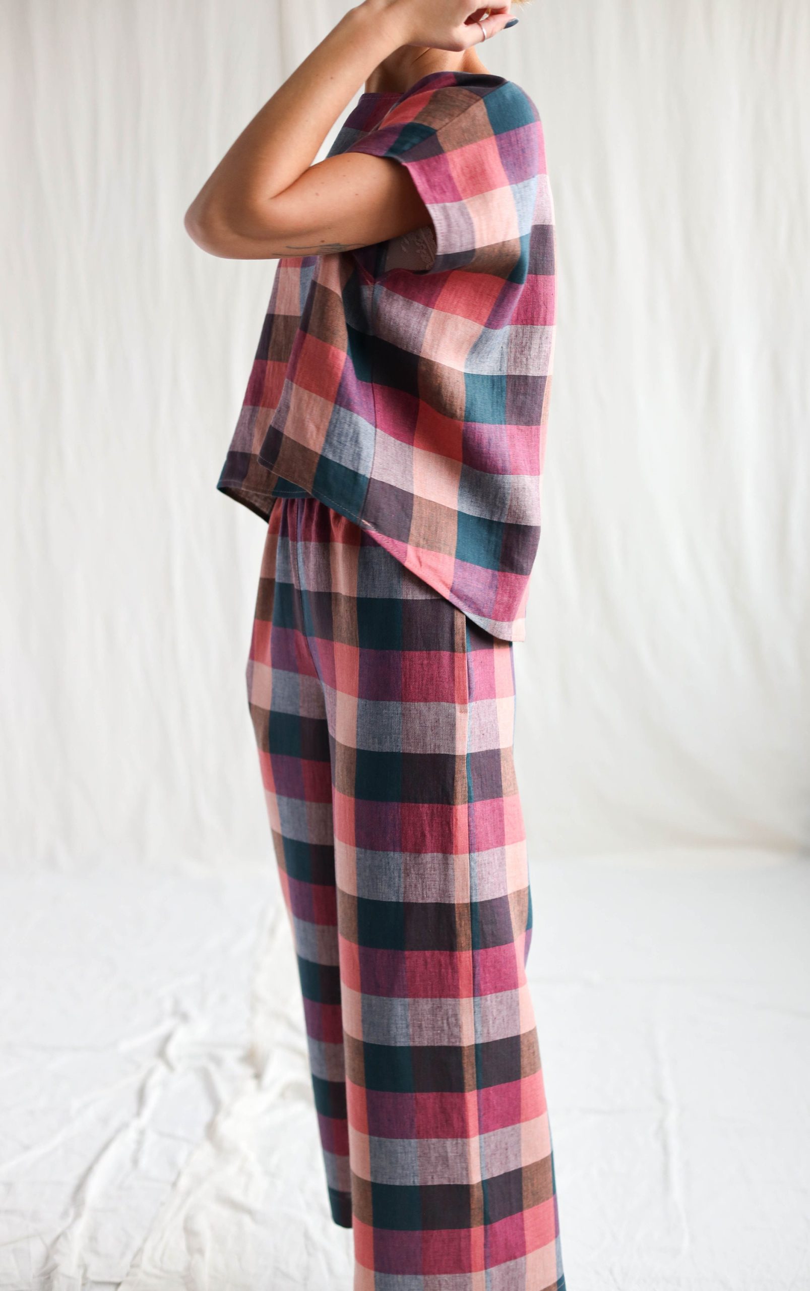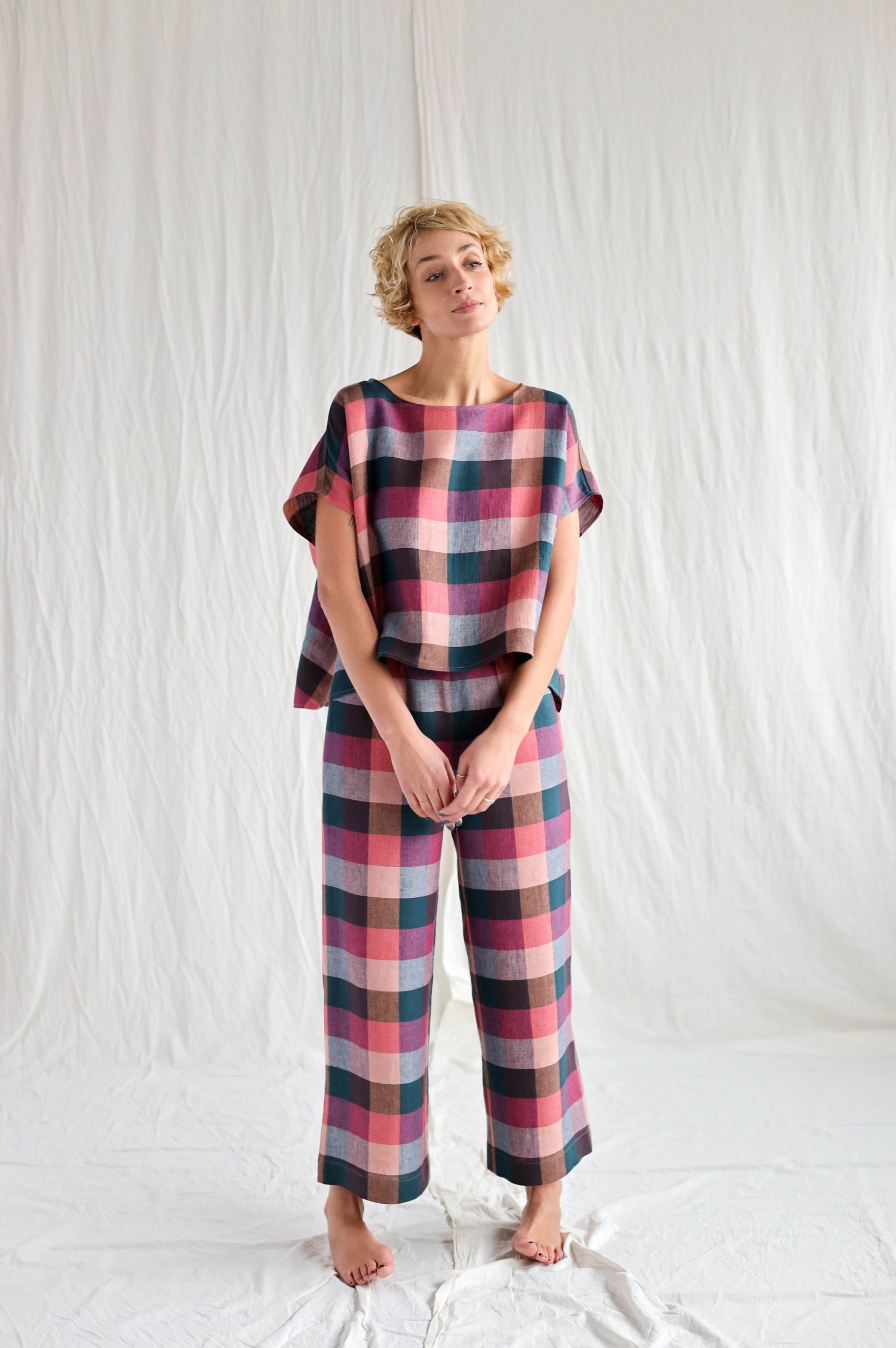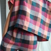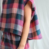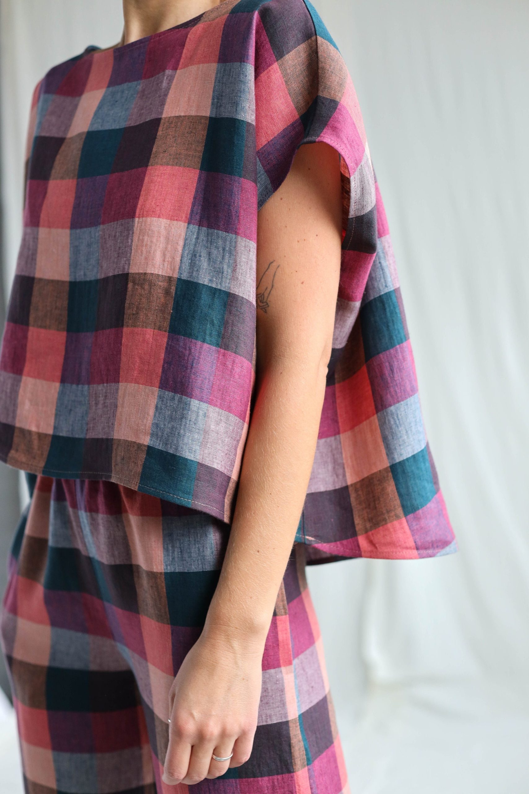 Simona is wearing a multicolored checks linen top in size S/M and is 172 cm/5’8″ tall.