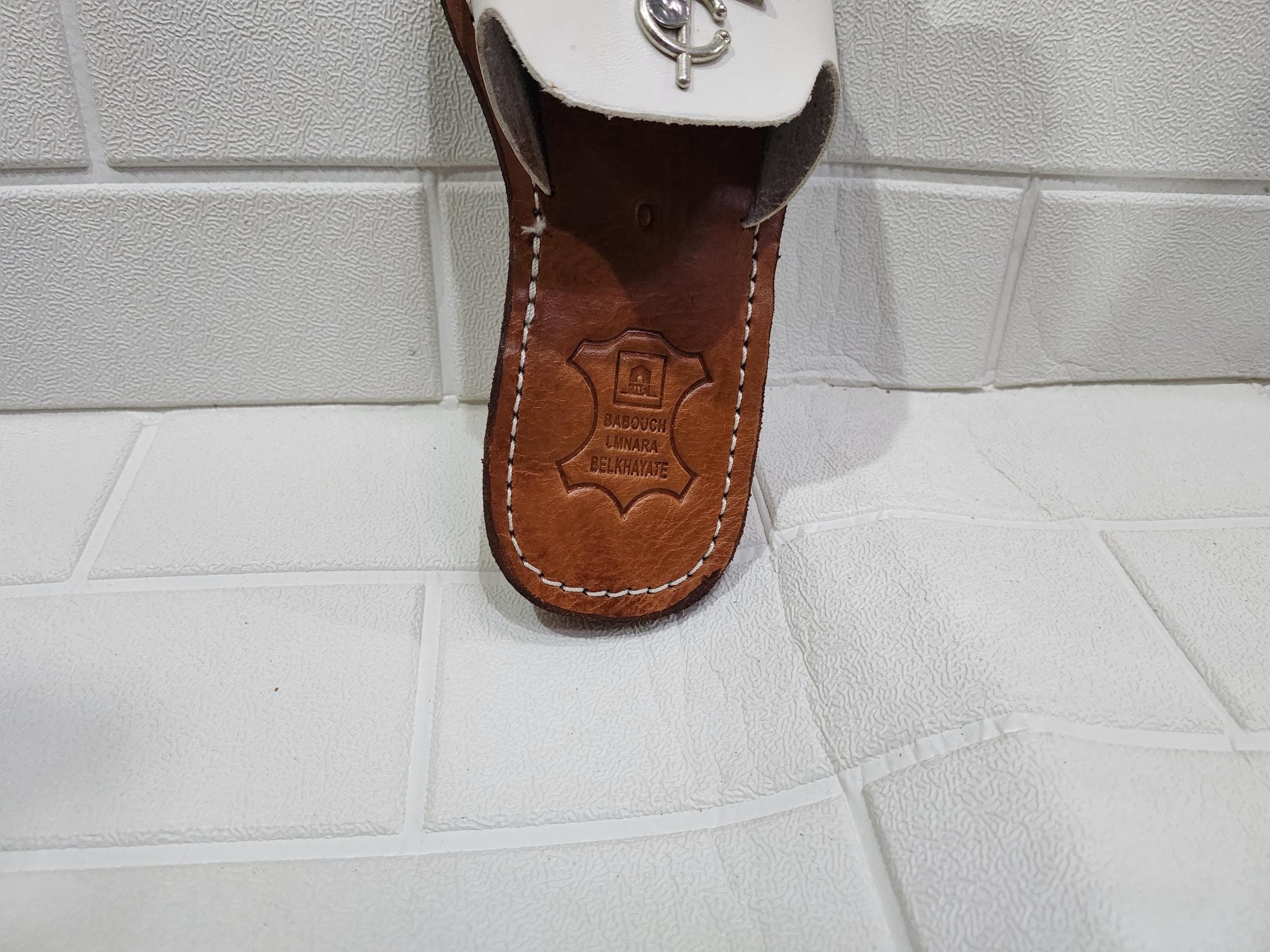 Step into elegance with our handcrafted Moroccan leather sandals – a true expression of tradition and style. Featuring a soft brown leather sole and a striking white leather strap, this pair is elevated with an engraved silver-tone triangle charm inspired by Amazigh heritage. The flat design makes them perfect for everyday wear, while their artisanal detailing adds a unique, boho-chic vibe.