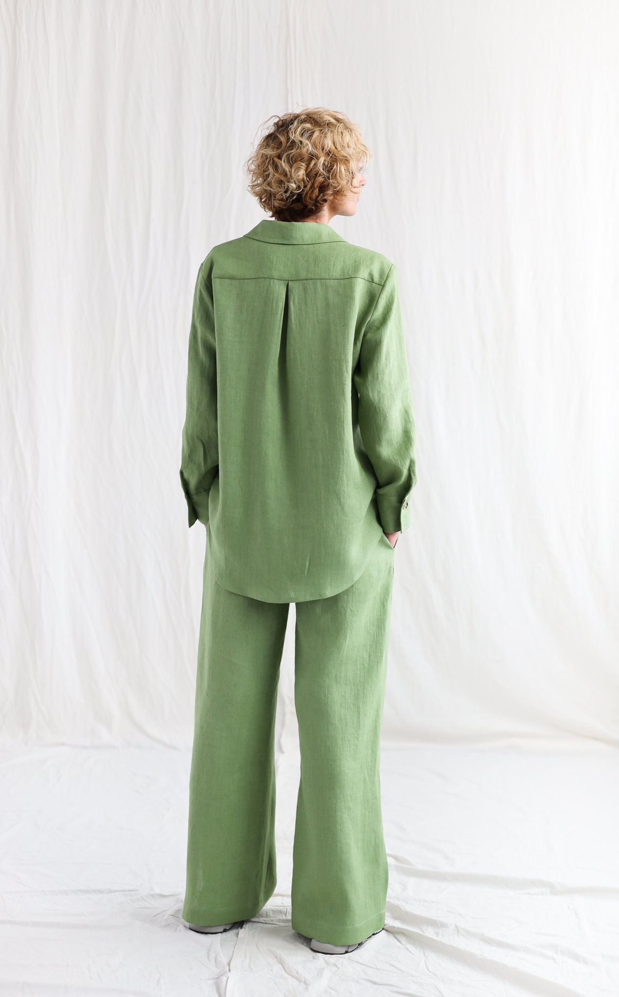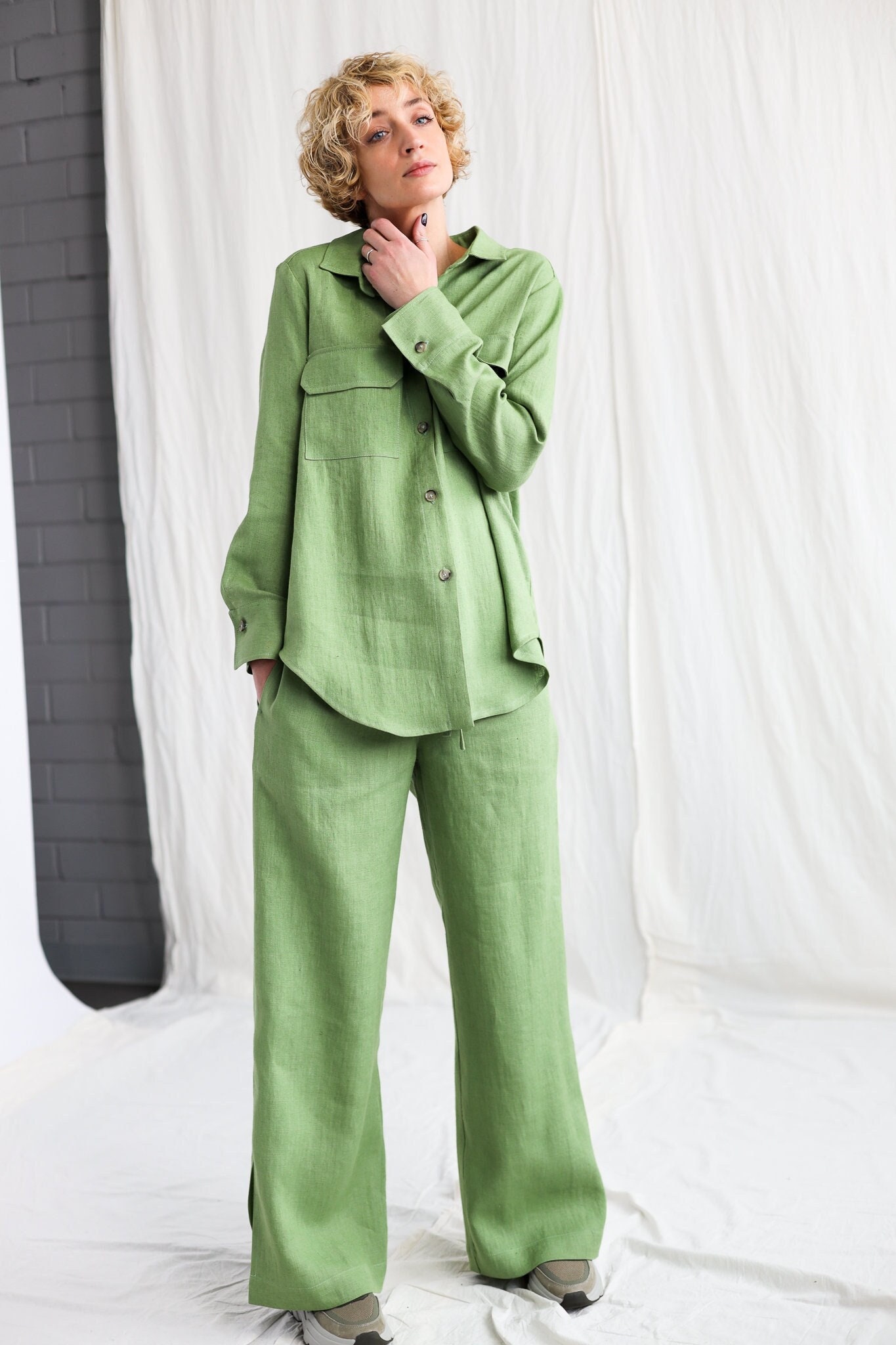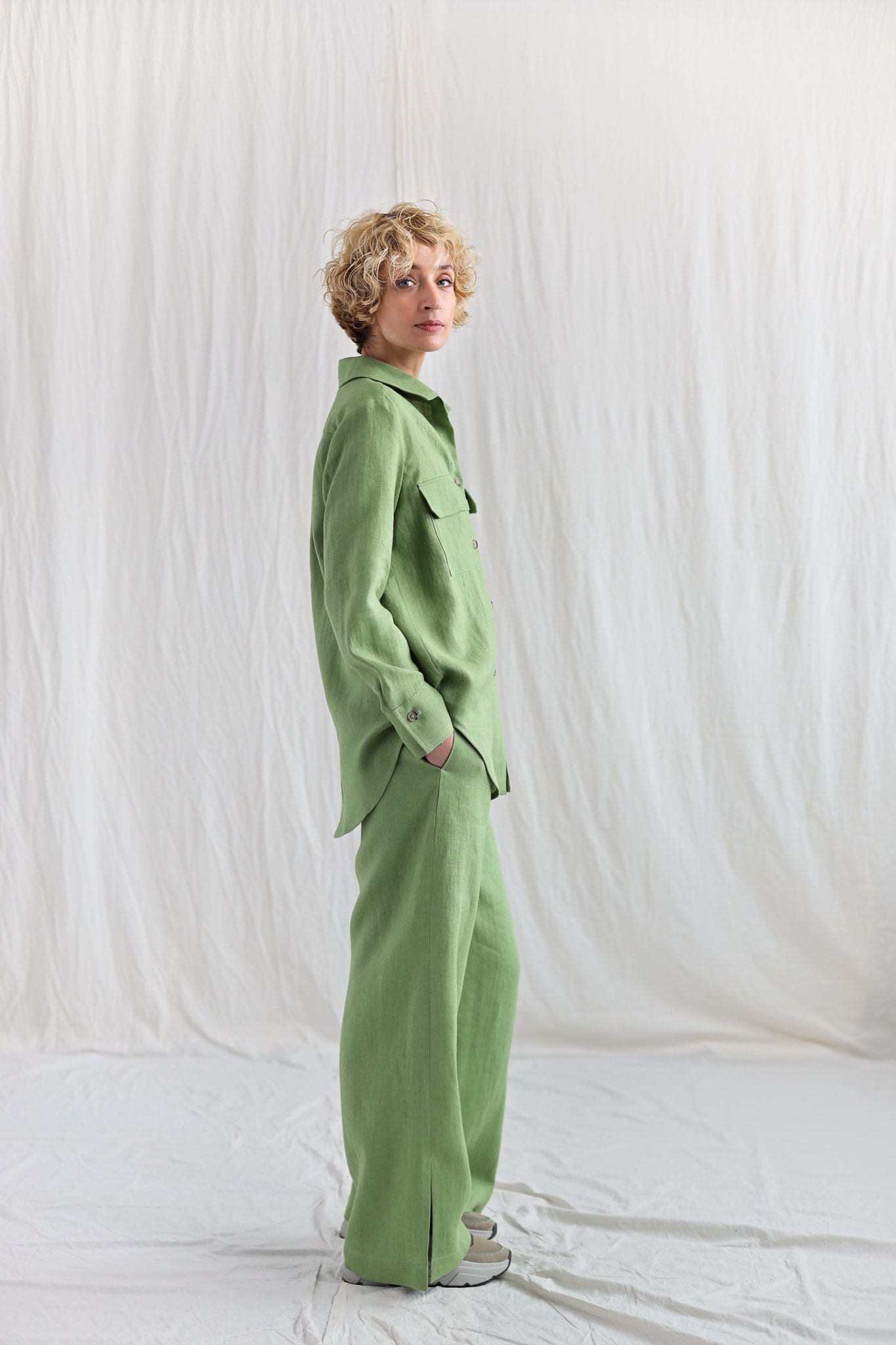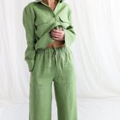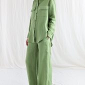 Simona is wearing “Foliage” color linen shirt and trousers in size S and is 172 cm/5’8″ tall.