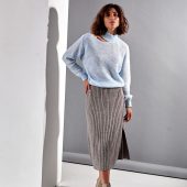 Knitted midi skirt with a slight trapeze silhouette made of half-wool yarn. The skirt is made in an elastic. shape-holding medium-density weave. The model has a vertical side cut. The waist is accentuated by a wide elastic belt.