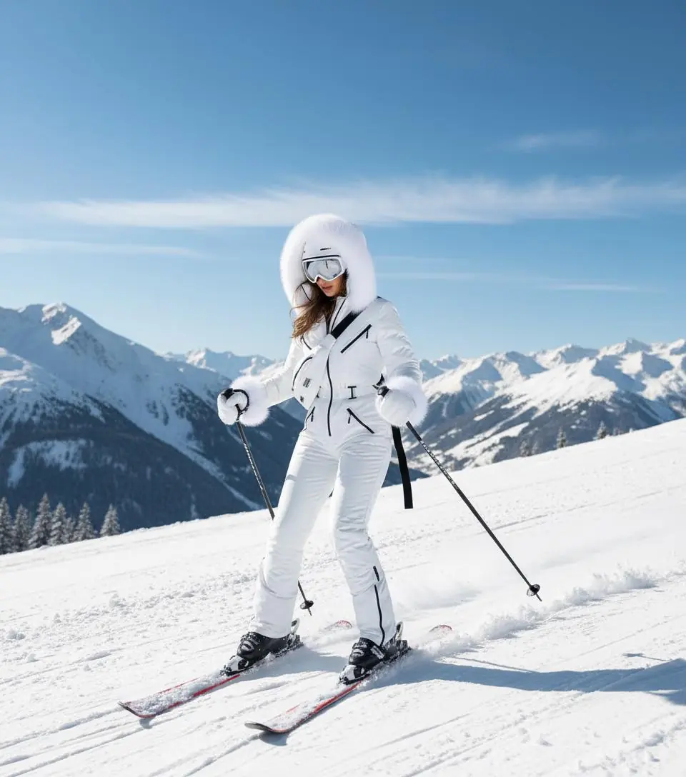 This ski jumpsuit combines functionality and elegance — ideal for ski resorts. mountain trips. or stylish winter walks.