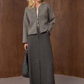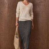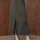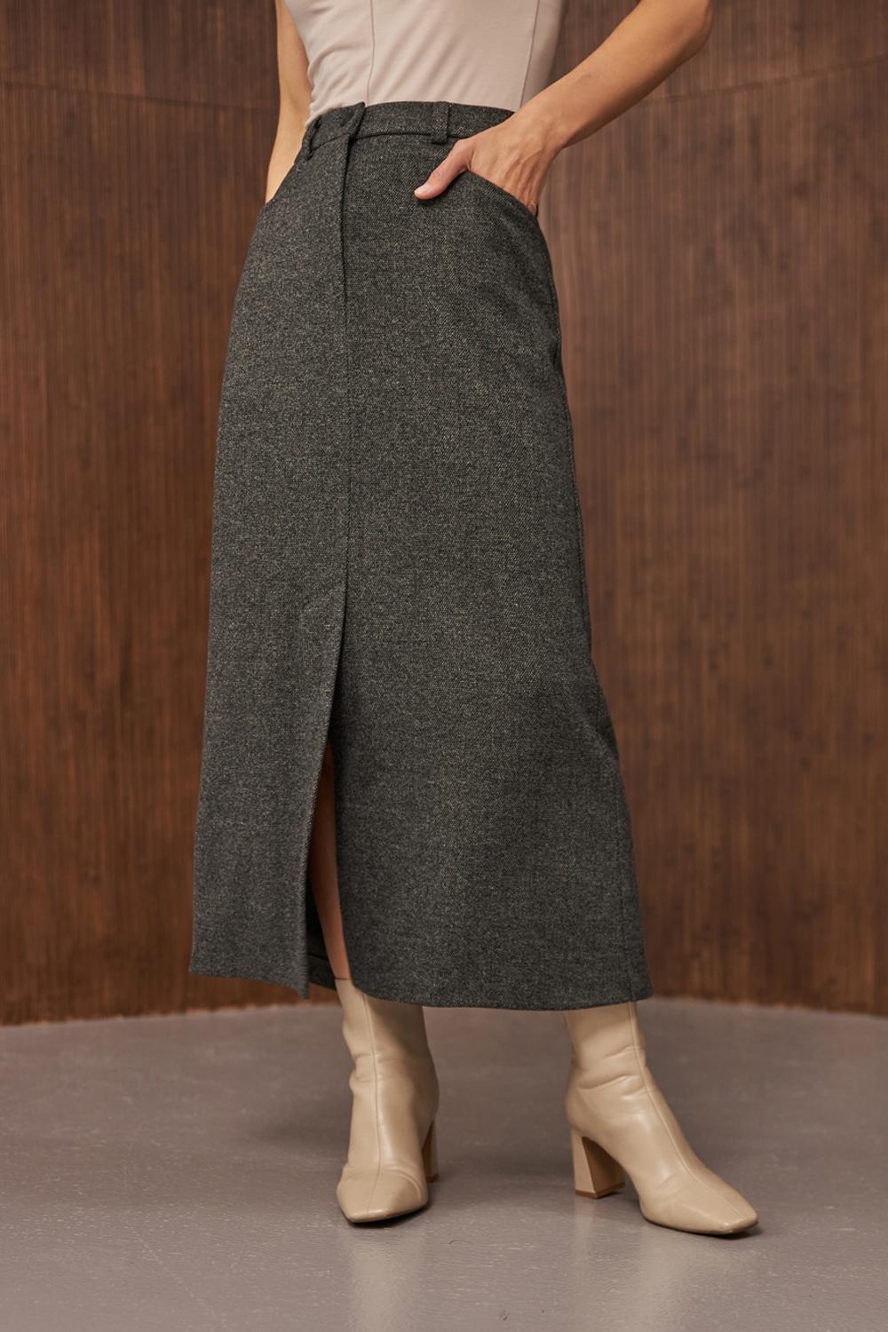 A warm midi skirt crafted from dense. soft wool fabric with added viscose for a smooth finish. Its straight. classic cut is complemented by a front slit that gives freedom of movement and a modern touch. The waistband features a hidden zipper and an elastic insert at the back for extra comfort. while two functional side pockets add practicality.